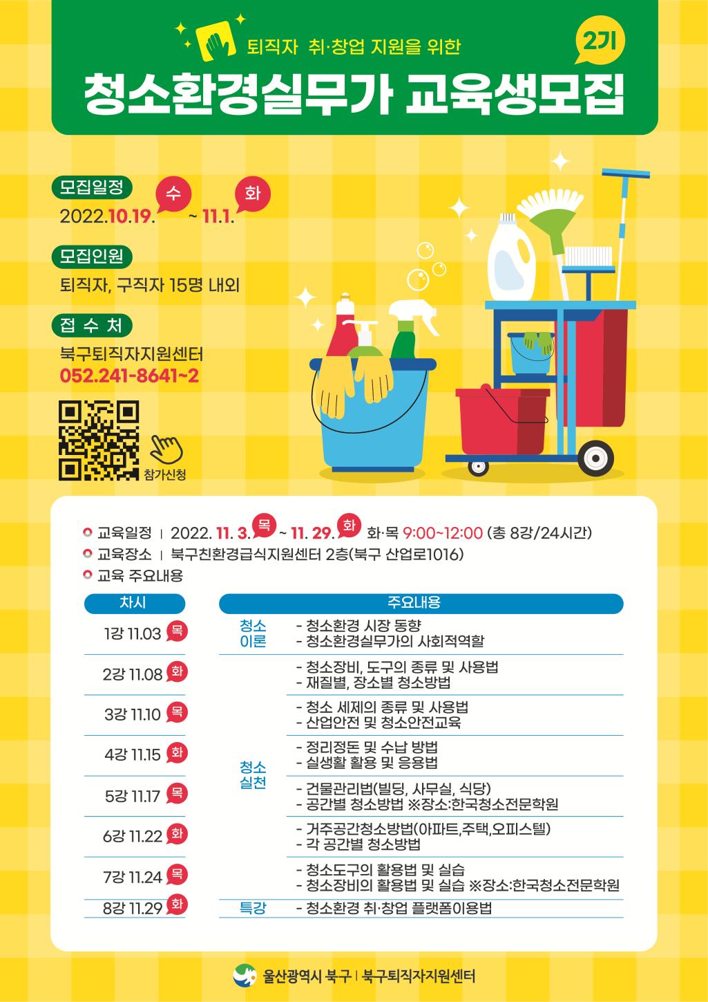 북구퇴직자지원센터에서 퇴직자들이 청소환경 분야에 재취업을 준비할 수 있도록 청소환경 분야 고용동향과 실무기능을 익힐 수 있는 현장실습 기회를 제공하고자 합니다. 청소환경분야도 전문가의 시대!! 함께 준비하실 교육생 모집합니다. ○ 모집일정 : 2022.10. 19.(수) ~ 11. 1.(화) ○ 접수방법 : 전화, 팩스 또는 방문접수 ○ 접 수 처 : 북구퇴직자지원센터 052.241-8641~2 링크 바로신청하기 https://naver.me/GQY0SEVq ○ 교육기간 : 2022. 11. 3.(목) ~ 11. 29.(화) ○ 교육시간 : 화·목 9:00 ~ 12:00(총 8강/24시간) ○ 교육장소 : 북구친환경급식지원센터 2층 외(북구 산업로1016) ○ 교육대상 : 신중년 퇴직자, 구직자 15명 내외