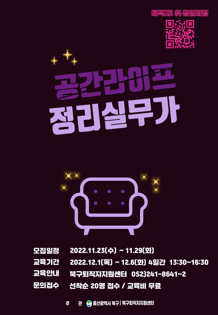 퇴직자지원센터 취창업과정_공간&라이프 정리실무가 교육생 모집 퇴직자 대상으로 공간정리에 대한 이해 및 정리수납 지식과 기술습득하고 공간정리 실무기능을 익혀 진로, 취·창업, 사회공헌 콘텐츠 제공하고자 교육을 운영합니다. □ 수강생 모집 ○ 모집일정 : 11. 23.(수) ~ 11. 29.(화) ○ 접수방법 : 전화, 방문, QR(신청링크 접속) ○ 신청하러 가기 (링크클릭) https://naver.me/xuCIW7CY ○ 전화접수처 : 241-8641~2 북구퇴직자지원센터(북구 산업로 1020 오토밸리복지센터 1층) □ 교육개요 ○ 기 간 : 12. 1. ~ 12. 6.(4일) 13:30 ~ 16:30 ※ 총12시간 ○ 장 소 : 북구평생학습관 4학습실(3층) ○ 대 상 : 신중년 은?퇴직자 15~20명 내외