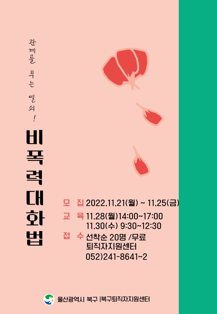 북구퇴직자지원센터_생애설계과정"관계를 푸는열쇠!비폭력대화법" ○ 퇴직자 의사소통 및 대화법 향상을 통해 가족 내 갈등 관리 능력 향상시키고, 가족 간의 친밀감 형성으로 건강한 가정형성에 도움이 되고자 비폭력대화법 교육에 참여할 퇴직자분들 모집합니다. ○ 모집일정 : 11. 21.(월) ~ 11. 25.(금) ○ 접수방법 : 전화 241-8641~2 / 링크 신청 https://naver.me/GEuAtqHV ○ 접 수 처 : 북구퇴직자지원센터(북구 산업로1020 오토밸리복지센터 1층) □ 교육개요 ○ 기 간 : 11. 28(월), 11. 30.(수) 각 14:00 ~ 17:00 ※ 총6시간(2일) ○ 장 소 : 평생학습관 2실습실 / 북구친환경급식지원센터 2층강당 ○ 대 상 : 신중년 은퇴직자 15~20명 내외 ○ 교육일정 1강 11.28(월) 14:00 ~ 17:00 - 자기이해 - 경청과 공감 대화법, 갈등 해결 대화법 - 비폭력 대화법 연습 2강 11.30(수) 9:30 ~ 12:30 - 자기효능감 높이는 대화법 - 가족의 이해 및 수용 - 행복한 가정 만드는 방법