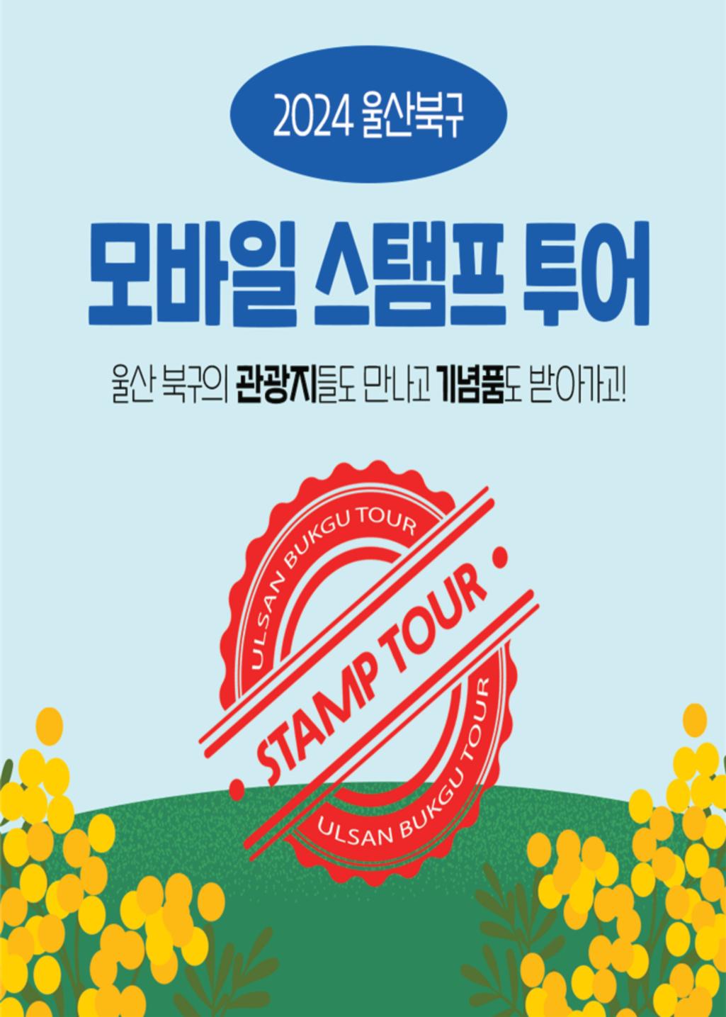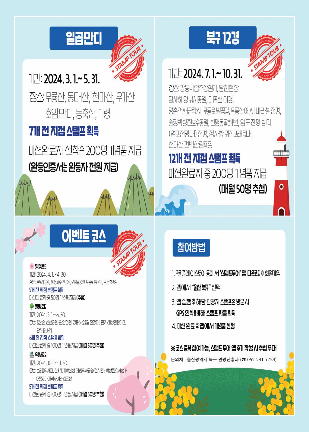 1. 기 간 : 2024. 3. 1. ~ 11. 30. 2. 코 스 : 5개 코스 운영 1) 일곱만디 - 기 간 : 2024. 3. 1. ~ 5. 31. - 장 소 : 무룡산, 동대산, 천마산, 우가산, 호암만디, 동축산, 기령 - 미션내용 : 7개 전 지점 스탬프 획득 - 미션완료자 선착순 200명 기념품 지급(완등인증서는 완등자 전원 지급) 2) 북구12경 - 기 간 : 2024. 7. 1. ~ 10. 31. - 장 소 : 강동화암주상절리, 달천철장, 당사해양낚시공원, 매곡천 야경, 명촌억새군락지, 무룡로 벚꽃길, 무룡산에서 바라본 전경, 송정박상진호수공원, 신명몽돌해변, 염포전망쉼터(염포전망대) 전경, 정자항 귀신고래등대, 천마산 편백산림욕장 - 미션내용 : 12개 전 지점 스탬프 획득 - 미션완료자 중 200명 기념품 지급(매월 50명 추첨) 3) 벚꽃로드 - 기 간 : 2024. 4. 1. ~ 4. 30. - 장 소 : 온누리공원, 화동못수변공원, 오치골공원, 무룡로 벚꽃길, 강동축구장 - 미션내용 : 5개 전 지점 스탬프 획득 - 미션완료자 중 50명 기념품 지급(추첨) 4) 힐링로드 - 기 간 : 2024. 5. 1. ~ 6. 30. - 장 소 : 울산숲, 신천공원, 연암정원, 강동해오름길 전망대, 판지해상관람데크, 당사 용바위 - 미션내용 : 6개 전 지점 스탬프 획득 - 미션완료자 중 100명 기념품 지급(매월 50명 추첨) 5) 역사로드 - 기 간 : 2024. 10. 1. ~ 11. 30. - 장 소 : 소금포역사관, 신흥사, 기박산성 의병역사공원(전시관), 박상진의사생가, 어물동 마애약사여래삼존상 - 미션내용 : 5개 전 지점 스탬프 획득 - 미션완료자 중 100명 기념품 지급(매월 50명 추첨) 3. 참여방법 1) 구글 플레이스토어 등에서 ‘스탬프투어’ 앱 다운로드 후 회원가입 2) 앱에서 “울산 북구” 선택 3) 앱 실행 후 해당 관광지 스탬프존 방문 시 GPS 인식을 통해 스탬프 자동 획득 4) 미션 완료 후 앱에서 기념품 신청