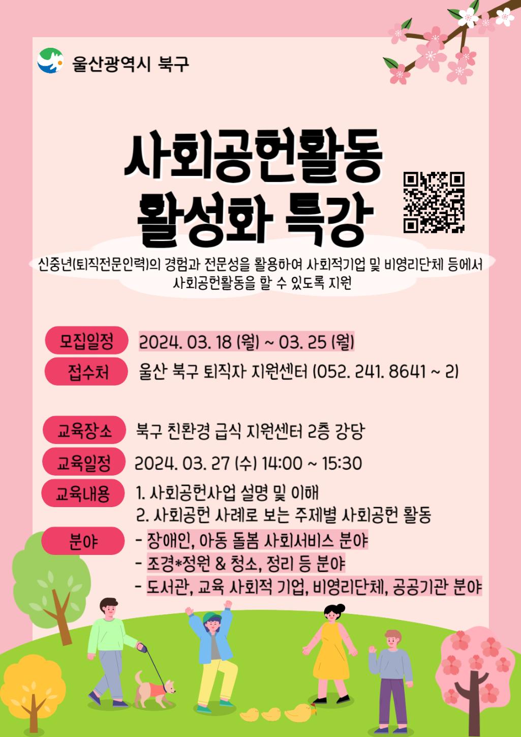 사회공헌활동 활성화 특강 참여자 모집 퇴직 후 쉬기에는 아깝고 경험을 활용하여 다시 활동, 취업준비해보시는 건 어떠신가요? 직업 경력, 은퇴 후 직업 경험을 통해 다양한 분야에서 활동할 수 있습니다 ?? 많은 관심과 참여 부탁드립니다~~ ※신중년(퇴직전문인력) 사회공헌사업란? 만 50세 이상~70세 미만 신중년(퇴직전문인력)의 경험과 전문성을 활용하여 사회적 기업 및 비영리단체 등에서 사회공헌활동을 할 수 있도록 지원하는 사업입니다.) ? 교육일정: 2024. 03. 27 (수) 14:00 ~ 15:30 ? 교육장소: 북구 친환경 급식지원센터 2층 강당 ? 교육내용: 1. 사회공헌사업 설명 및 이해 2. 사회공헌 사례로 보는 주제별 사회공헌활동 ? 분야: - 장애인, 아동 돌봄 사회서비스분야 - 조경*정원 & 청소, 정리 등 분야 - 도서관, 교육 사회적기업, 비영리단체, 공공기관분야 ? 참여자 자격조건: 만 50세이상 70세 미만 울산 미취업자 ? 모집일정: 2024. 03. 18 (월) ~ 2024. 03. 25 (월) ? 접수처: 울산 북구 퇴직자지원센터 전화접수(052.241 ? 8641~2 / 241~8619~20) 혹은 아래 링크에서 신청 ↓ ↓ ↓ https://forms.gle/JBXzPWwxjebNFErp6