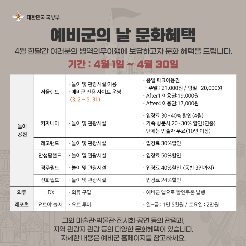 예비군 문화 및 복지 혜택 : 4.1.(월) ~ 30(화)