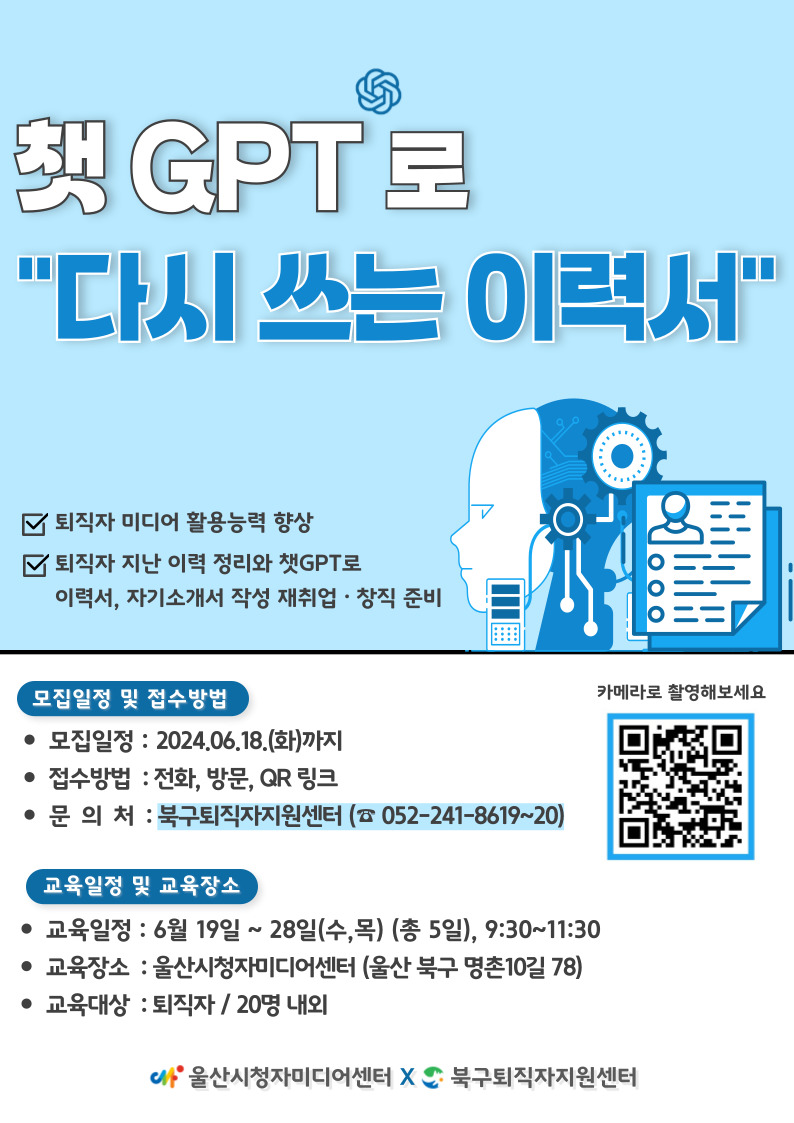 퇴직자취업지원교육과정"챗-GPT×다시 쓰는 이력서" 교육생 모집 ○ 교육기간 : 2024. 6. 19.(수) ~ 6. 28.(금) ○ 교육시간 : 수·목·금 9:30 ~ 11:30(총5강/15시간) ○ 교육장소 : 울산시청자미디어센터 강당(북구 명촌10길 78) ○ 교육목적 및 내용 : - 인공지능(AI)시대에 신중년 은·퇴직자의 미디어 활용능력 함양 - 디지털 콘텐츠를 활용한 이력서 및 포트폴리오 디자인 및 제작 - Chat-GPT활용을 통한 구직기술 습득 및 취업 온라인플랫폼 접근성 제고 접수일정: 6.10(월)~6.17(월) 접수처:북구퇴직자지원센터(북구산업로 1020 오토밸리복지센터 1층) 접수방법 : 241-8619~20 /241-8641~2 QR링크로 접수하러가기=> https://naver.me/5Ead3f3T ![]() ![]() |