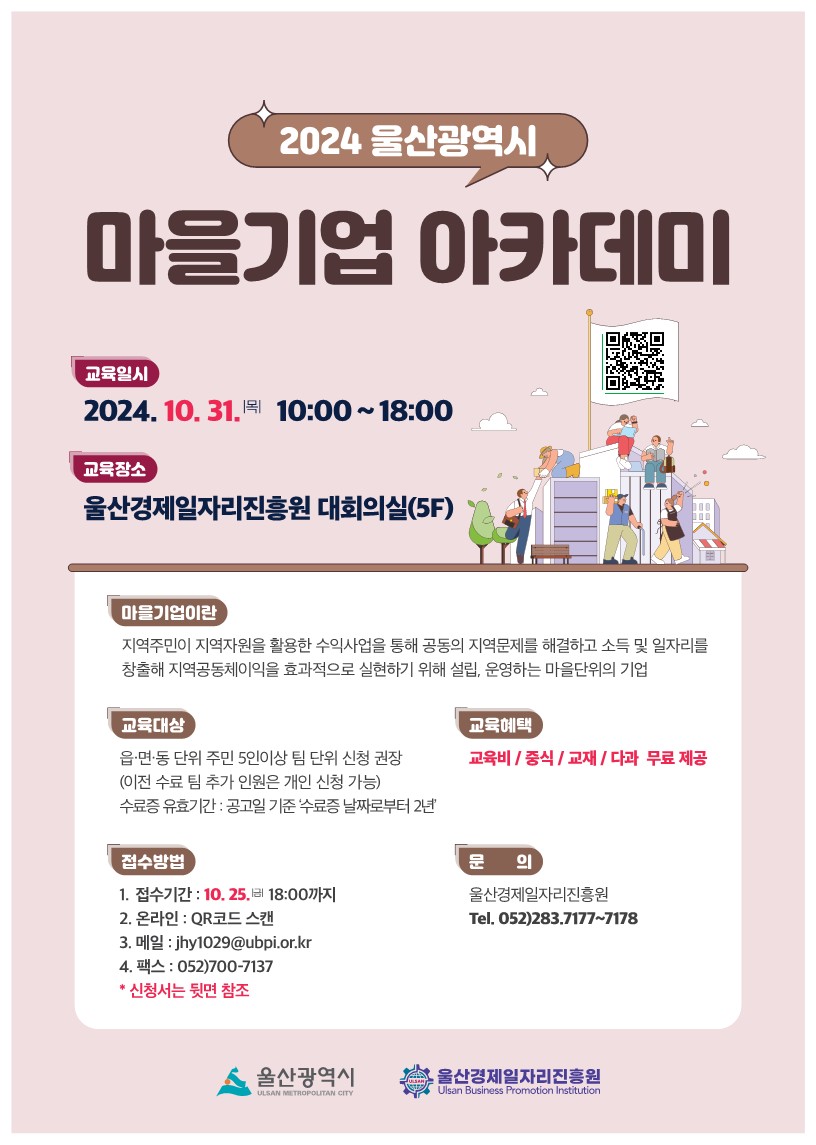 2024 울산광역시 마을기업 아카데미 교육일시 2024. 10. 31.(목) 10:00 ~ 18:00 교육장소 울산경제일자리진흥원 대회의실 (5층) 울산광역시 울산경제일자리진흥원 *자세한 내용은 첨부파일을 참고해 주십시오.