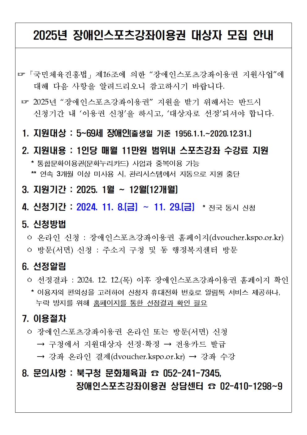 2025년 장애인스포츠강좌이용권 대상자 모집안내 1. 지원대상 : 5~69세 장애인(출생일 기준 1956.1.1.~2020.12.31.) 2. 지원내용 : 1인당 매월 11만원 범위내 스포츠강좌 수강료 지원 * 통합문화이용권(문화누리카드) 사업과 중복이용 가능 ** 연속 3개월 이상 미사용 시, 관리시스템에서 자동으로 지원 중단 3. 지원기간 : 2025. 1.~ 12. 4. 신청기간 : 2024. 11. 8. ~ 11.29. 5. 신청방법 - 온라인 신청 : 스포츠강좌이용권 홈페이지 (dvoucher.kspo.kr.kr) - 방문(서면)신청 : 주소지 구청 또는 동 행정복지센터 방문 6. 문의사항 : 북구청 문화체육과 052-241-7345