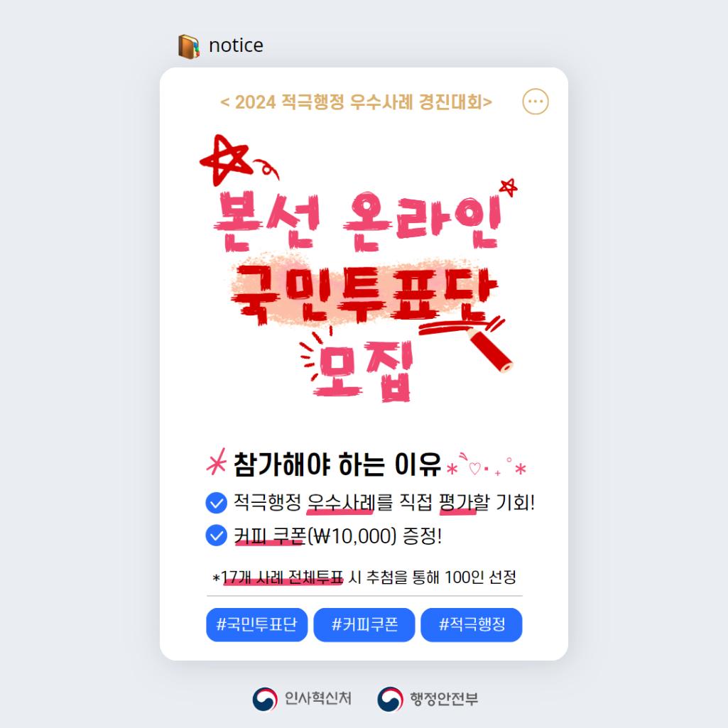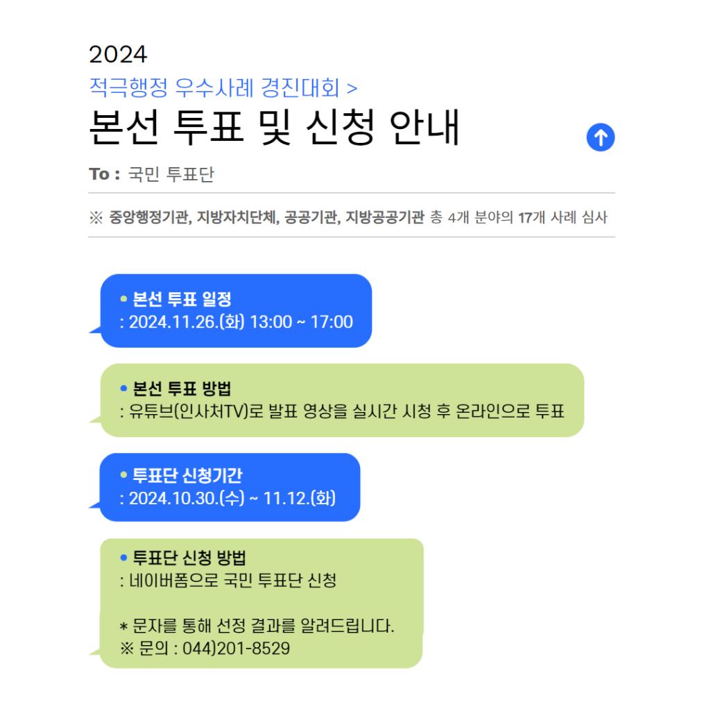 <2024 행정안전부 적극행정 우수사례 경진대회 본선 온라인 국민투표단 모집> ○ 신청기간: 2024. 10. 30.(수)~11. 12.(화) ○ 신청방법: 네이버폼으로 국민투표단 신청 ※ 문자를 통해 선정결과 통보 ○ 심사일정: 2024. 11. 26.(화) 13:00~17:00 ○ 심사방법: 유튜브채널<인사처TV> 생중계로 발표영상 실시간 시청 후 온라인으로 투표 ○ 심사대상: 중앙행정기관, 지방자치단체, 공공기관, 지방공공기관 총 4개 분야의 2024년 적극행정 우수사례(17개)