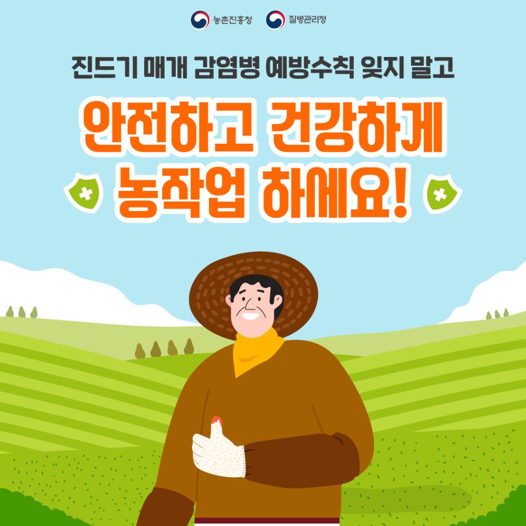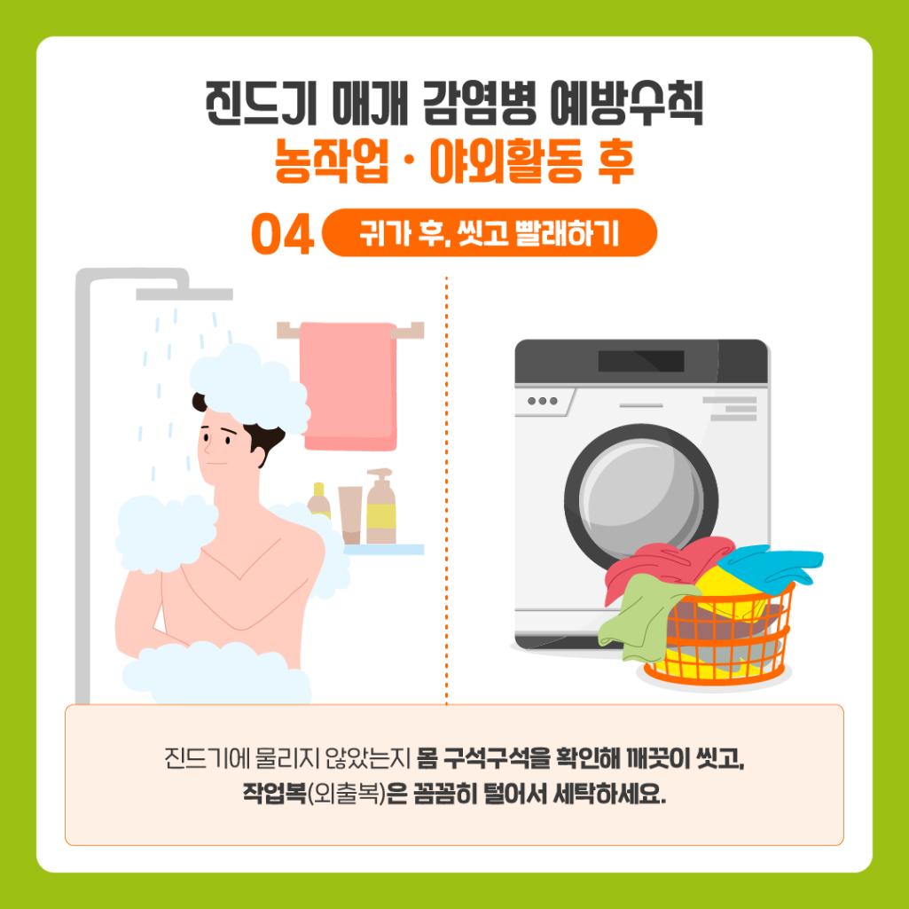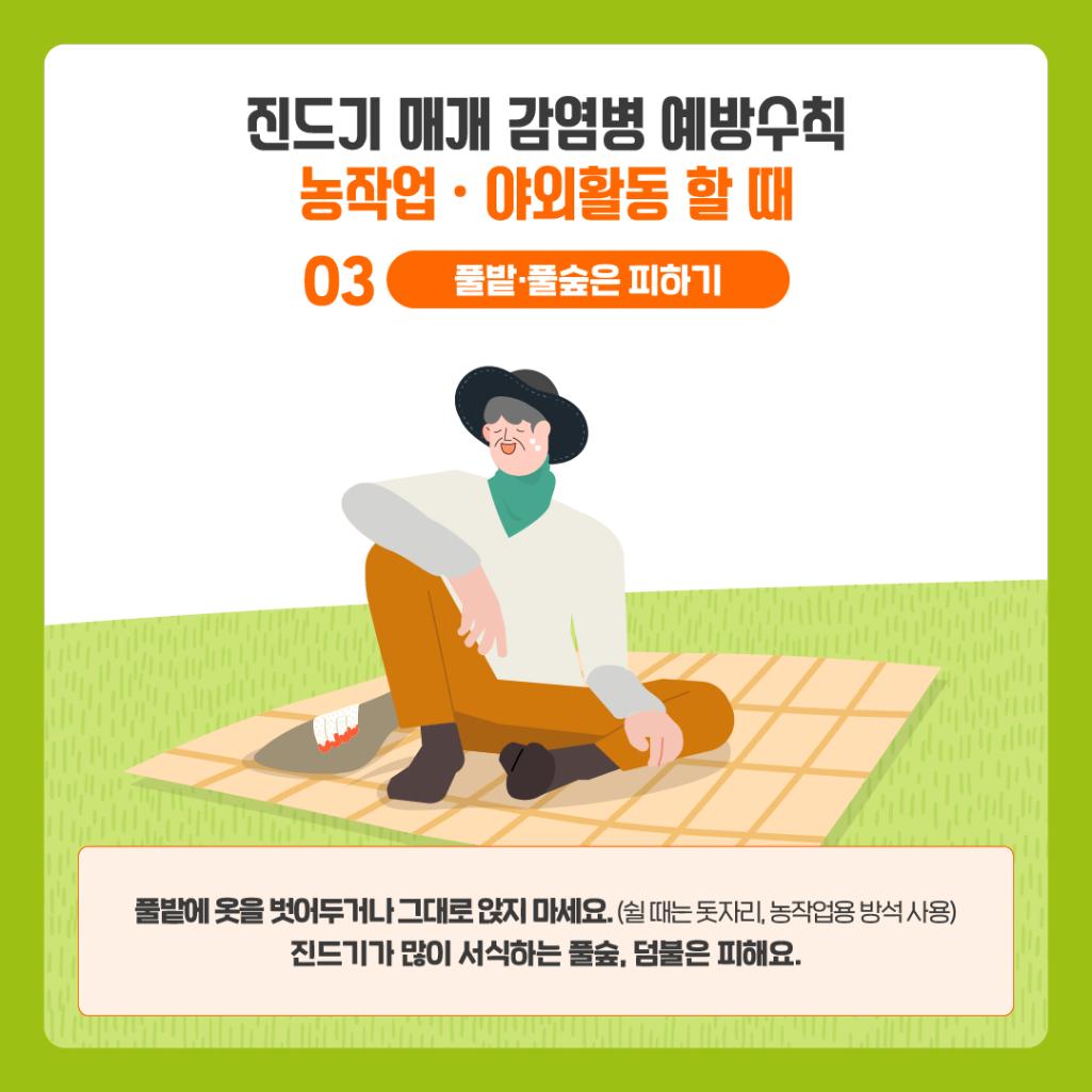 <평상시/농작업 전> - 전용 농작업복 구비 및 작업 시 항상 착용 - 풀숲 제거 : 농경지 및 주변, 거주지 및 주변 등 - 진드기 기피제 보조 사용 : 농작업복에 도포 - 농작업 중 : 풀숲과 접촉 기회 회피 - 풀숲에 옷 벗어 놓지 않기 - 휴식 시 돗자리 사용 - 보조도구 이용 : 농작업용 앞치마 또는 방석 - 풀숲에서의 용변 금지 - 농작업 후 - 농작업복 일체 세탁하기 : 귀가 즉시 평상복과 분리 세탁 - 목욕 : 귀가 즉시, 입욕을 추천하나 샤워도 가능 - 적기치료 : 농작업 등 야외작업 수행 후 감기증상이나 - 가피(검은 딱지) 발견 즉시 꼭 의료기관 방문 치료