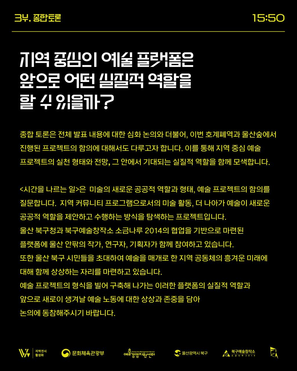 호계역 100년의 역사와 사람을 잇는 "시간을 나르는 일" 전시와 연계하여 개최하는 포럼을 다음과 같이 알려드리니 많은 관심 부탁드립니다. - 문의처 : 북구예술창작소 소금나루2014(☎ 052-289-8169)