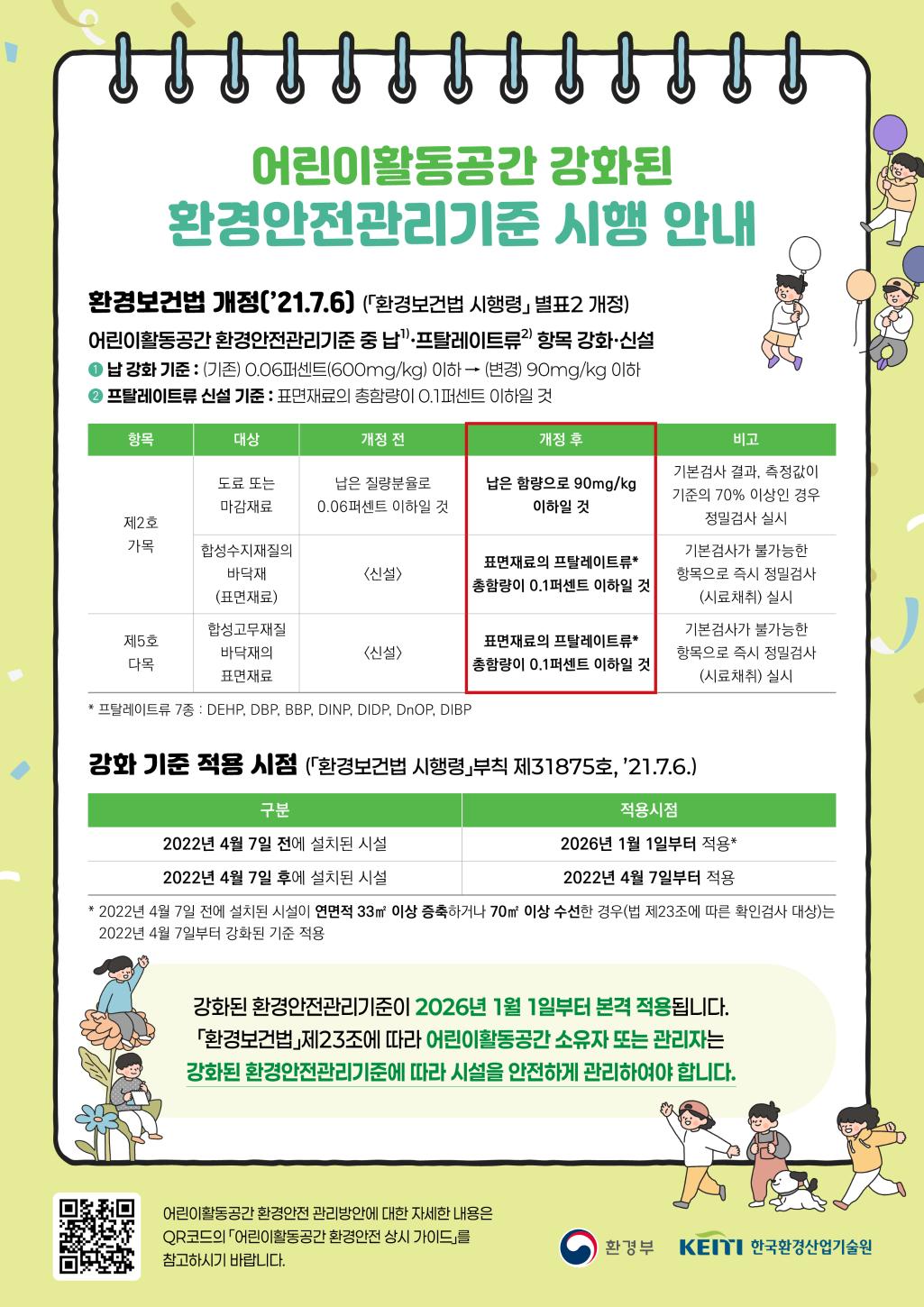 어린이활동공간 강화된 환경안전관리기준 시행 안내 환경보건법 개정 ('21.7.6) (환경보건법 시행령 별표2 개정) 어린이활동공간 환경안전관리기준 중 납, 프탈레이트류 항목 강화, 신설 1. 납 강화 기준 : (기존) 0.06퍼센트(600mg/kg) 이하 -> (변경) 90mg/kg 이하 2. 프탈레이트류 신설 기준 : 표면재료의 총함량이 0.1퍼센트 이하일 것 제2호 가목 / 대상: 도료또는 마감재료 / (개정전) 납은 질량분율로 0.06퍼센트 이햐일 것 -> (개정후) 납은 함량으로 90mg/kg이하일 것 / 비고 : 기본검사 결과, 측정값이 기준의 70% 이상인 경우 정밀검사 실시 제2호 가목 / 대상: 합성수지재질의 바닥재(표면재료) / (개정전) <신설> -> (개정후) 표면재료의 프탈레이트류*총함량이 0.1퍼센트 이하일 것 / 비고 : 기본검사가 불가능한 항목으로 즉시 정밀검사(시료채취)실시 제5호 다목 / 대상:합성고무재질 바닥재의 표면재료 / (개정전) <신설> -> (개정후) 표면재료의 프탈레이트류*총함량이 0.1퍼센트 이하일 것 / 비고 : 기본검사가 불가능한 항목으로 즉시 정밀검사(시료채취)실시 강화 기준 적용 시점(환경보건법 시행령 부칙 제31875호, '21.7.6.) - 2022년 4월 7일 전에 설치된 시설 : 적용시점 ( 2026년 1월 1일부터 적용) - 2022년 4월 7일 후에 설치된 시설 : 적용시점 ( 2022년 4월 7일부터 적용) * 2022년 4월7일 전에 설치된 시설이 연면적 33m2 이상 충족하거나 70m2 이상 수선한 경우(법 제23조에 따른 확인검사 대상)는 2022년4월7일부터 강화된 기준 적용 강화된 환경안전관리기준이 2026년 1월 1일부터 본격 적용됩니다. [환경보건법] 제 23조에 따라 어린이활동공간 소유자 또는 관리자는 강화된 환경안전관리기준에 따라 시설을 안전하게 관리하여야 합니다. *QR코드 : 어린이활동공간 환경안전 관리방안에 대한 자세한 내용은 QR코드의 [어린이활동공간 환경안전 상시 가이드]를 참고하시기바랍니다. - '이미지 내 QR코드를 스캔하여 세부내용을 확인해보세요.'
