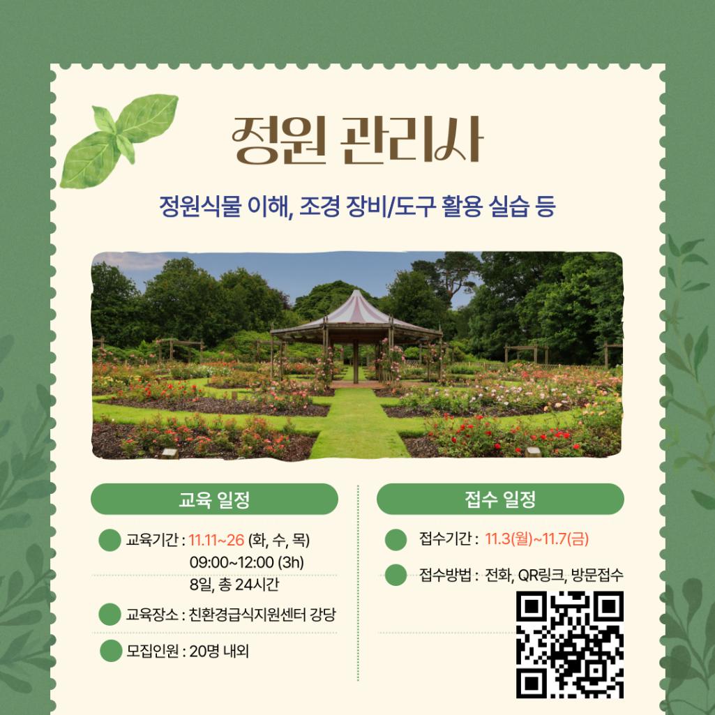 아래 내용을 참고하시어 많은 참여 부탁드립니다. ○ 모집일정 : 2025. 11. 3.(월) ~ 11. 7.(금) 17:00 ○ 접수방법 : 방문, QR링크, 전화 접수(9:00~17:00) ○ 대상 : 신중년 퇴직자, 구직자 20명 내외 ○ 접수처 : 북구퇴직자지원센터 052.241-8619~20 링크로 신청하러 가기 => https://naver.me/F16NxLMr? ○ 교육기간 : 2025. 11. 11.(화) ~ 11. 26.(수)/: 화·수·목 9:00 ~ 12:00 (총 8강/24시간) ○ 교육장소 : 북구친환경급식지원센터 2층 외 실습장소