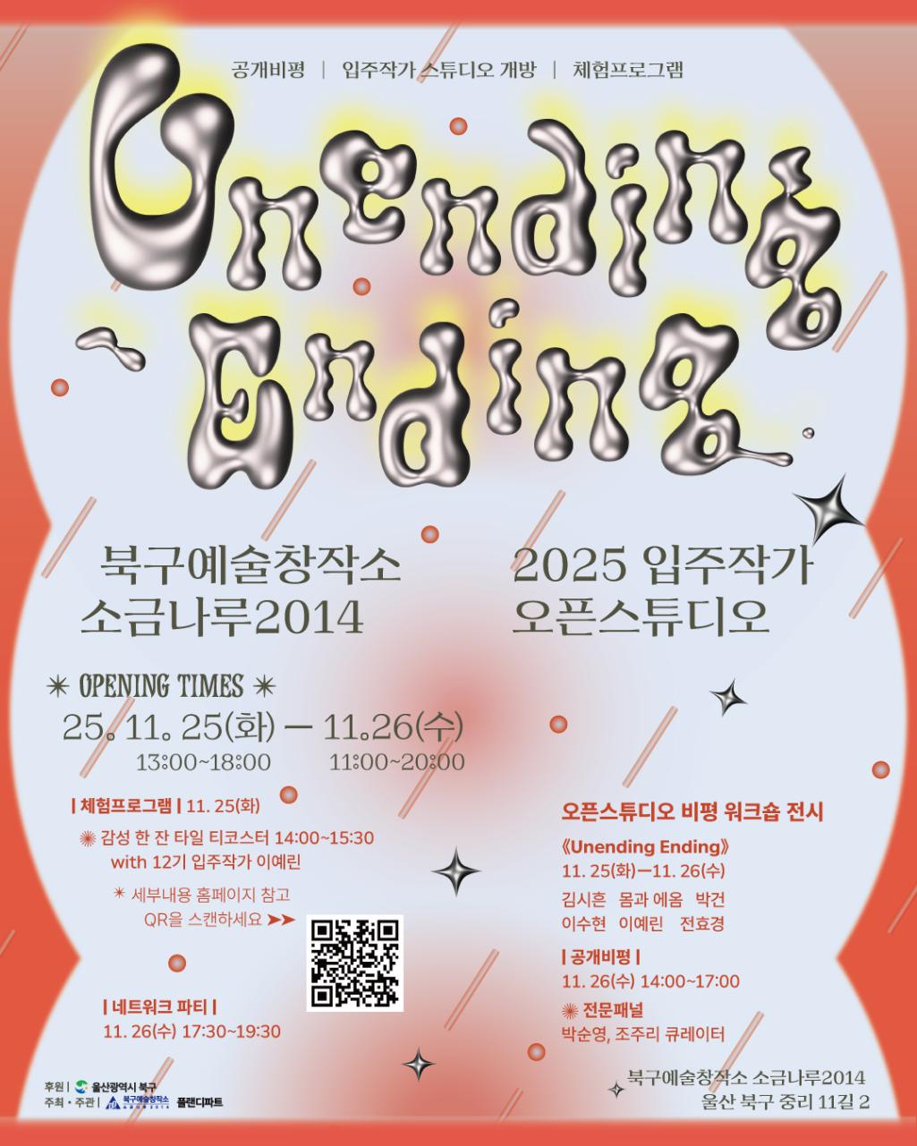 북구예술창작소 소금나루2014에서 2025년도 입주작가를 대상으로 오픈스튜디오 행사를 개최하오니 주민여러분의 많은 관심 바랍니다. ○ 기간 - 11. 25.(화) 13:00~18:00 - 11. 26.(수) 11:00~20:00 ○ 장소 : 소금나루2014(중리11길 2)
