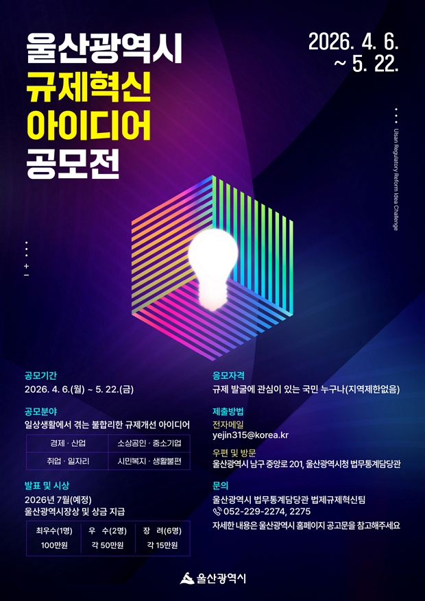 1. 공 모 명 : 2026년 울산광역시 규제혁신 아이디어 공모전 2. 공모기간 : 2026. 4. 6.(월) ~ 5. 22.(금) 3. 공모분야 : 일상생활에서 겪는 불합리한 규제개선 아이디어 - 경제, 산업 - 소상공인, 중소기업 - 취업, 일자리 - 시민복지, 생활불편 4. 발표 및 시상 : 2026년 7월(예정), 울산광역시장상 및 상금 지급 - 최우수(1명), 100만원 - 우수(2명), 각 50만원 - 장려(6명), 각 15만원 5. 응모자격 : 규제 발굴에 관심 있는 국민 누구나(지역제한없음) 6. 제출방법 - 전자메일 : yejin315@korea.kr - 우편 및 방문 : 울산광역시 남구 중앙로 201, 울산광역시청 법무 통계담당관 7. 문의 : 울산광역시 법무 통계담당관 법제규제혁신팀(052-229-2274, 2275) ※ 자세한 내용은 울산광역시 홈페이지 공고문을 참고해주세요