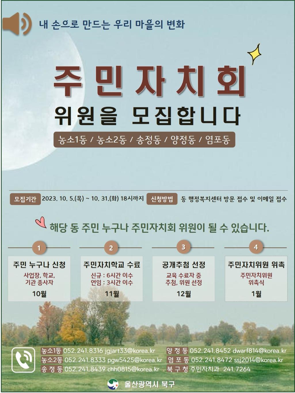 「울산광역시 북구 주민자치회 및 주민자치센터 설치·운영에 관한 조례」 제8조에 따라 풀뿌리 주민자치 활성화와 민주적 참여의식 고양을 위해 새롭게 주민자치회를 구성하는 농소1동 주민자치회 위원을 다음과 같이 공개모집 합니다. 1. 모집기간 : 2023. 10. 5.(목) ~ 10. 31.(화) 2. 모집인원 : 50명 3. 임 기 : 2024. 1. 1. ~ 2025. 12. 31.까지 (2년) 4. 지원자격 : 만18세 이상 해당동 주민 누구나(해당동 소재 학교, 기관, 단체, 사업장 종사자 포함) 5. 제출서류 : 지원서, 개인정보 수집이용제공 동의서 6. 접수방법 : 해당동 행정복지센터 본인 방문접수 7. 필수조건 : 주민자치학교 교육 수료 후 이수증 제출 8. 선정방법 : 주민자치학교 이수자 중「공개추첨」등으로 위원 선정 9. 문 의 처 : 해당동 행정복지센터 <농소1동> ☎ 052.241.8316 <주민자치과> ☎ 052.241.7264