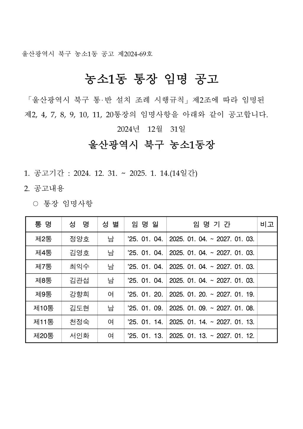 농소1동 통장 임명 공고(제2, 4, 7, 8, 9, 10, 11, 20통)