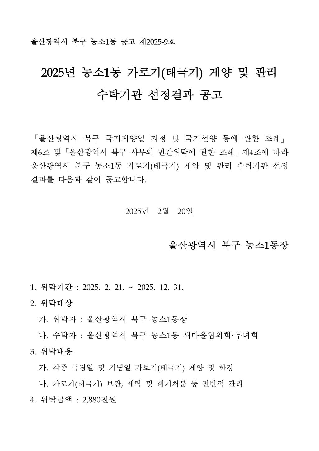 2025년 농소1동 가로기(태극기) 게양 및 관리 수탁기관 선정결과 공고