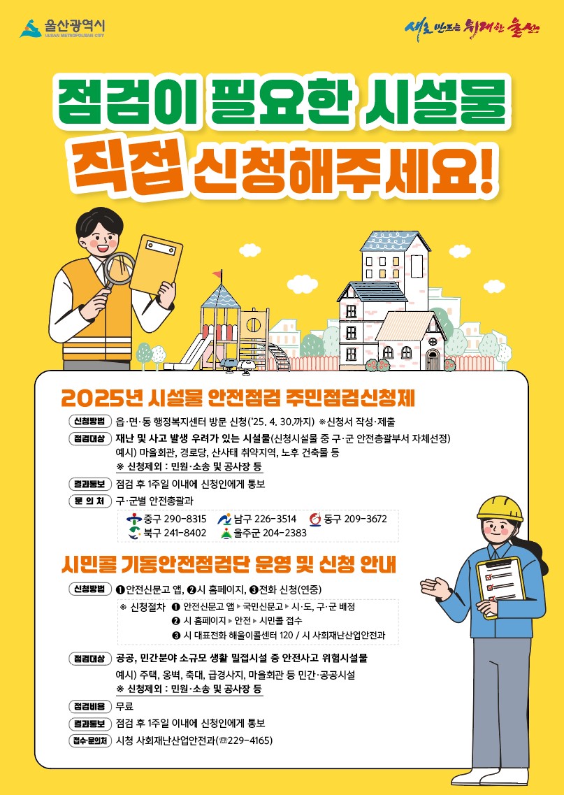 - 신청방법: 읍면동 행정복지센터 방문 신청('25. 4. 30.까지) - 점검대상: 재난 및 사고 발생 우려가 있는 시설물 예시) 마을회관, 경로당, 산사태 취약지역, 노후 건축물 등 ※ 신청제외: 관리자가 있는 시설물, 민원·소송 및 공사장 - 문 의 처: 구·군별 안전총괄과(중구290-8315,남구226-3514,동구209-3672,북구241-8402,울주군204-2383)