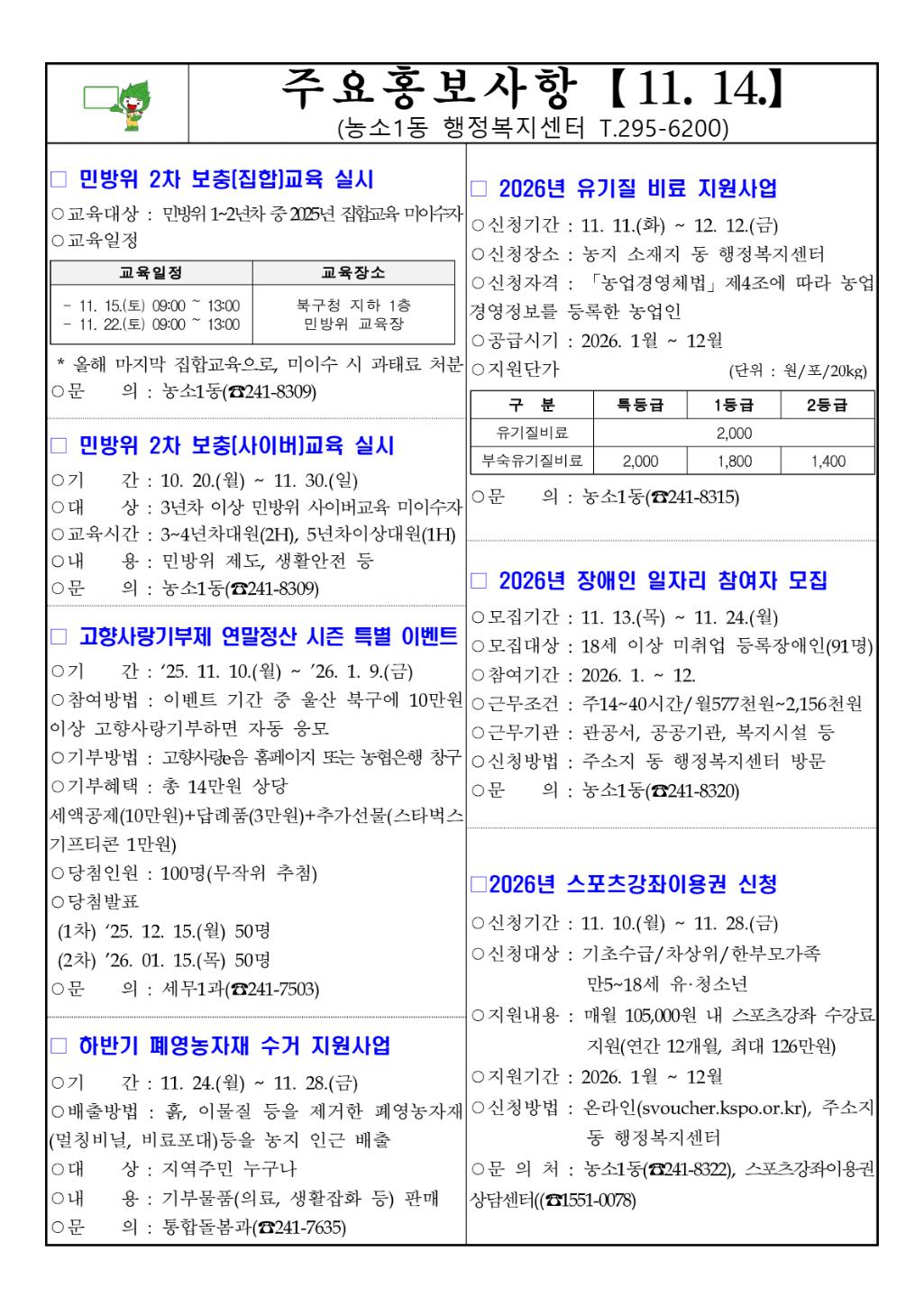 2026년 제1분기 농소1동 주민자치센터 수강생 모집 공고