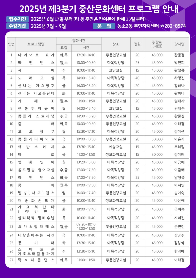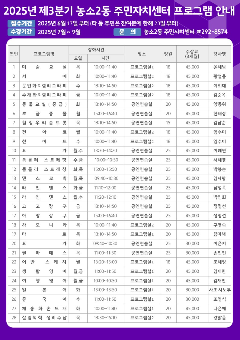 | 2025년 3분기 농소2동 주민자치센터, 중산문화센터 프로그램 안내 | |||