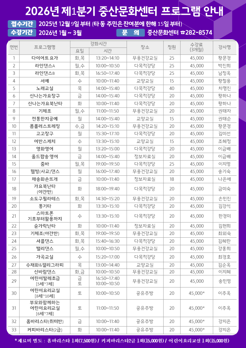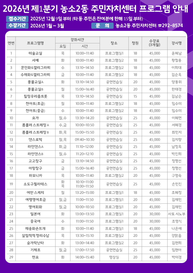 「울산광역시 북구 주민자치회 및 주민자치센터 설치·운영에 관한 조례」에 따라 2026년 1분기 농소2동 주민자치센터·중산문화센터 수강생 모집을 붙임과 같이 공고합니다. 붙임 : 2026년 1분기 프로그램 수강생 모집 --------------------------------- |