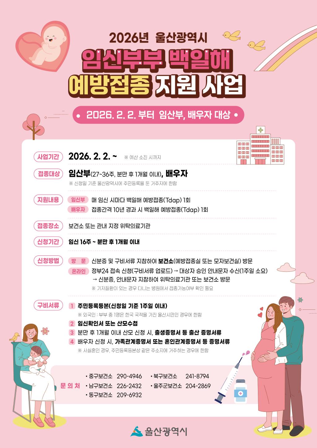 ○ 사업기간 : 2026. 2. 2. ~ ※예산 소진 시까지 ○ 접종대상 : 임산부(27~36주, 분만 후 1개월 이내), 배우자 ○ 지원내용 - 임산부 : 매 임신 시마다 백일해 예방접종(Tdap) 1회 - 배우자 : 접종간격 10년 경과 시 백일해 예방접종(Tdap) 1회 ○ 신청기간 : 임신 16주 ~ 분만 후 1개월 이내 ○ 신청방법 - 방문 : 신분증 및 구비서류 지참하여 북구보건소(예방접종실) 방문 - 온라인 : 정부24 접속(구비서류 업로드) → 대상자 승인 안내문자 수신(1주일 소요) → 신분증, 안내문자 지참하여 위탁의료기관 또는 보건소 방문 ○ 문 의 : 보건소 (☎241-8794) |