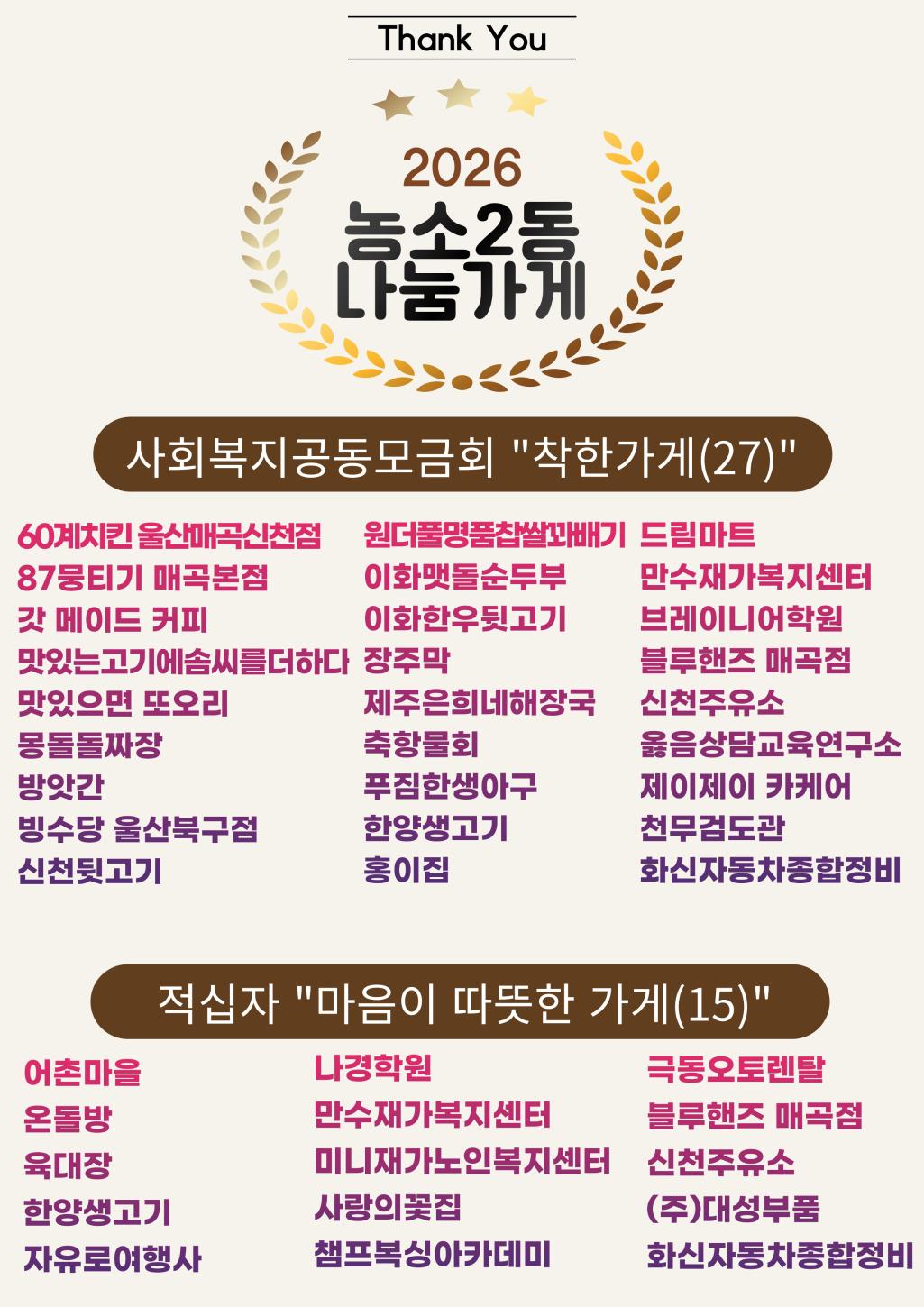 사회복지공동모금회 "착한가게"와 적십자사 "마음이 따뜻한 가게"에 참여해주고 계신 업체 현황입니다.