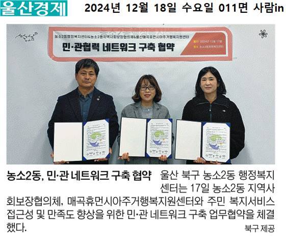 | (24. 12. 17.) 울산매곡휴먼시아주거행복지원센터, 농소2동행정복지센터, 농소2동지역사회보장협의체 민·관협력 네트워크 구축 협약 | |||