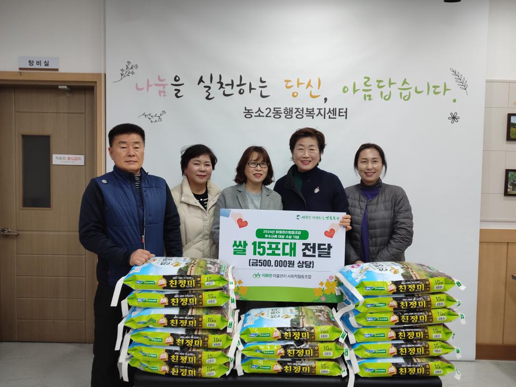 이화정 마을관리 사회적협동조합에서 2024년 마을관리협동조합 우사사례 대상 수상 기념으로 농소2동 취약계층에 백미 10kg 15포(50만원 상당)를 기부해주셨습니다.