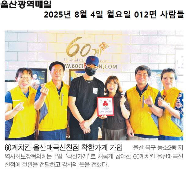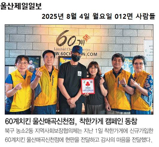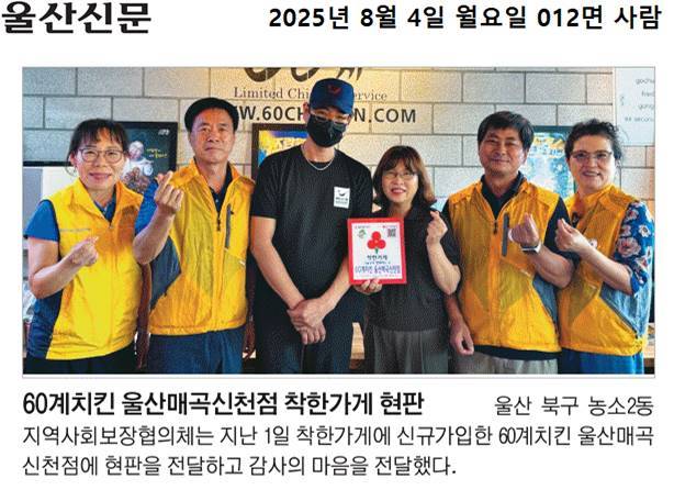 (25. 8. 1.) 신규 착한가게 가입, 60계치킨 울산매곡신천점 현판 전달