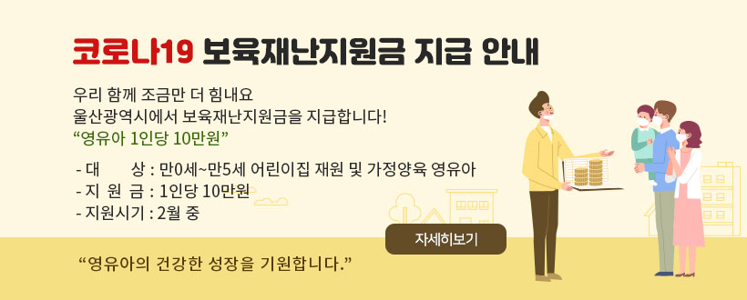 울산광역시에서 코로나바이러스감염증-19로 인해 보육의 혜택을 충분히 받지 못하고 있는 영유아의 건강한 성장 지원과 부모의 양육부담을 덜어드리고자 다음과 같이 보육재난지원금을 지원합니다. 1. 지급대상 : 2021. 2. 1. 현재 울산광역시에 주소를 둔 자 중 만 0세 ~ 만 5세 어린이집 재원 및 가정양육 영유아, 취학유예 어린이집 재원 아동 2. 지급시기 : 2021. 2월중 3. 지급금액 : 영유아 1인당 10만원 4. 지급방법 : 아동수당 통장계좌로 입금 5. 이의신청 : 보육재난지원금 지급일로부터 60일 이내 6. 문 의 처 : 농소3동행정복지센터(052-241-8364)