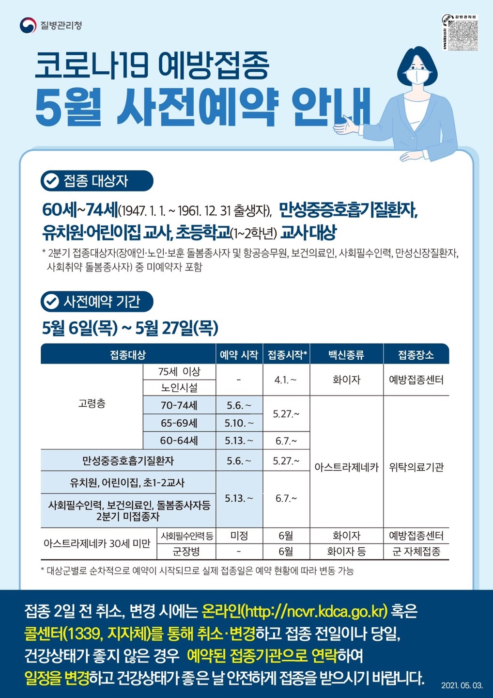 □ 코로나19 예방접종 사전예약 개요 가. 접종 대상자 : 60세 ~ 74세(1947.1.1.~1961.12.31. 출생자), 만성중증호흡기 질환자, 유치원·어린이집 교사, 초등학교(1~2학년) 교사 대상 나. 사전예약 기간 : 5월 6일(목) ~ 5월 27일(목) ※ 사전예약기간 이후에는 위탁의료기관으로 직접 전화하여 예약 다. 예약 방법 ① 온라인예약 : 코로나19 사전예약시스템 접속( https://ncvr.kdca.go.kr ) ② 전화예약 : 보건복지부 콜센터 ☎ 129 / 질병관리청 콜센터 ☎ 1339 울산 해울이 콜센터 ☎ 052-129 / 북구 보건소 ☎ 052-241-8785 / ③ 행정복지센터 방문(전화) 예약 : ☎ 052-241-8393 / 신분증, 본인명의 휴대전화 지참 ※ 전화예약은 상담지연이 발생할 수 있으므로 “온라인예약”을 권장 드립니다 라. 접종 장소 : 관내 위탁의료기관(주소지 상관없이 접종 가능) ※ 기타 자세한 내용은 아래 홍보물 참조 붙임 : 울산 북구 코로나19 위탁의료기관 현황.