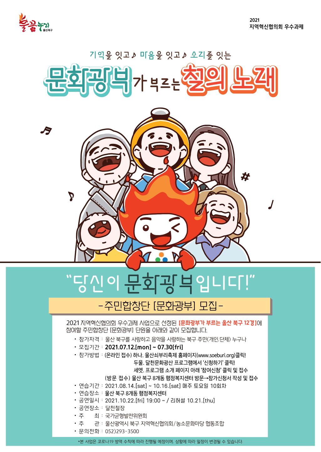 * 주민합창단 ‘문화광부’를 아래와 같이 모집하오니 주민여러분의 많은 관심 및 참여 부탁드립니다. ○ 기 간 : 7. 12. ~ 7. 30. ○ 대 상 : 북구 주민(개인, 단체) 누구나(325명) ○ 참가방법 : (온라인 접수) 울산쇠부리축제 홈페이지(www.soeburi.org)