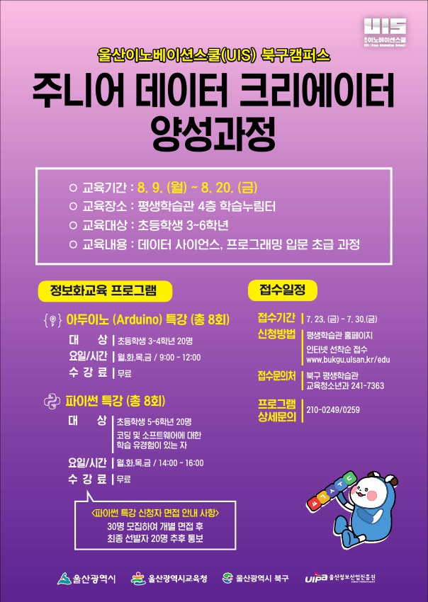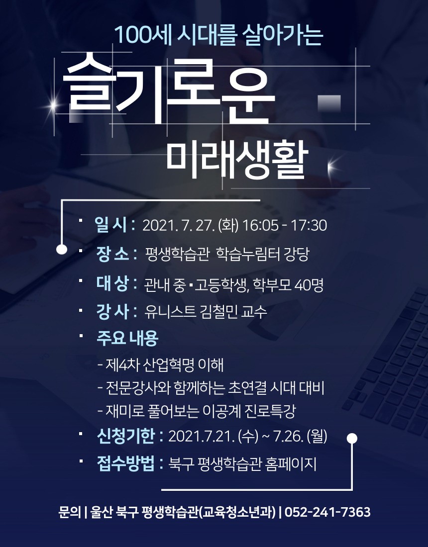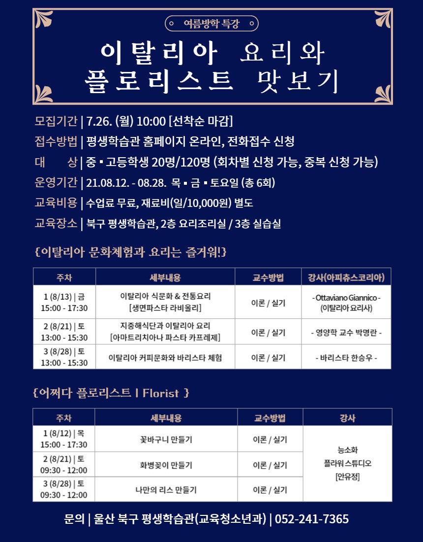- 접수기간 : 프로그램별 접수기간 상이, 안내문 참고 - 접수방법 : 북구 평생학습관 홈페이지 선착순 접수(https://www.bukgu.ulsan.kr/edu/main/main.jsp) - 교육장소 : 평생학습관 4층 학습누림터 등 - 교육과정 * '100세 시대를 살아가는 슬기로운 미래생활' 특강 / 유니스트 교수 * 주니어 데이터크리에이터 양성과정(초3~6) / 정보산업진흥원 전문강사진 * 이탈리아 요리와 플로리스트 맛보기(중~고등학생) / 이탈리아 요리사 등 |