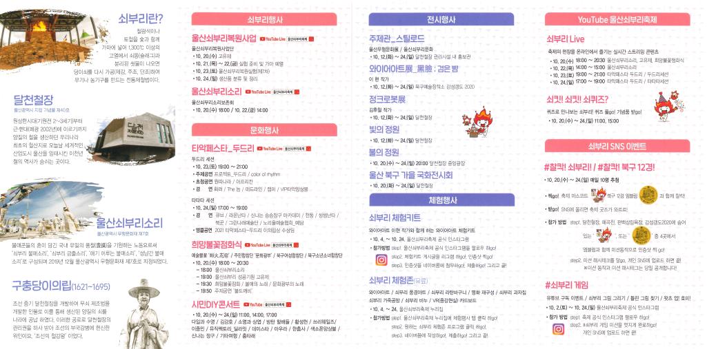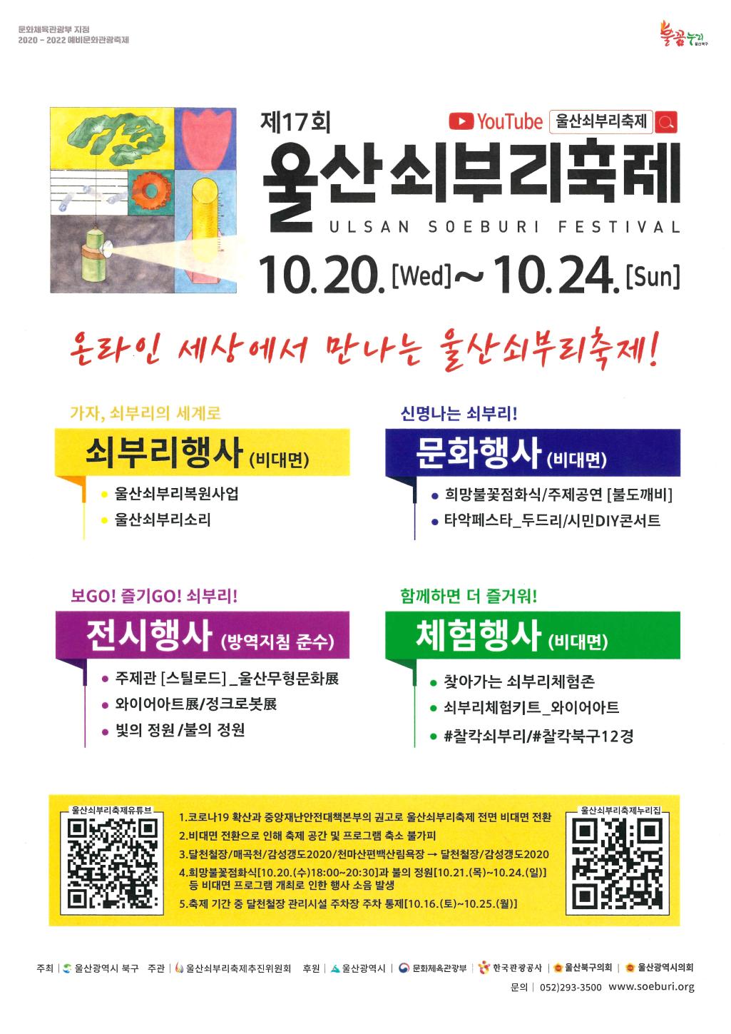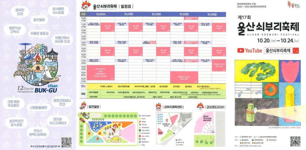 □ 제17회 울산쇠부리축제 ○ 기 간 : ‘21. 10. 20.(수) ~ 10. 24.(일)[5일간] ○ 주요행사 - 쇠부리 행사(유튜브) : 울산쇠부리복원사업, 울산쇠부리소리 - 문화행사(유튜브) : 희망불꽃점화식, 타악페스타, 시민DIY콘서트 등 - 전시행사(방역지침 준수) : 주제관(스틸로드), 정크로봇展, 빛의 정원 등 - 체험행사(누리집) : 온라인 쇠부리체험존, 쇠부리 체험키트 - 온라인행사 : 쇠부리LIVE, #찰칵 쇠부리, #찰칵 북구12경 등 ○ 참여방법 : 유튜브 ‘울산쇠부리축제’ 검색 또는 QR코드 스캔