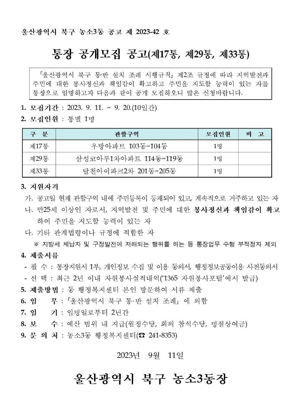 ★농소3동 통장 공개모집 공고(제17통, 제29통, 제33통)