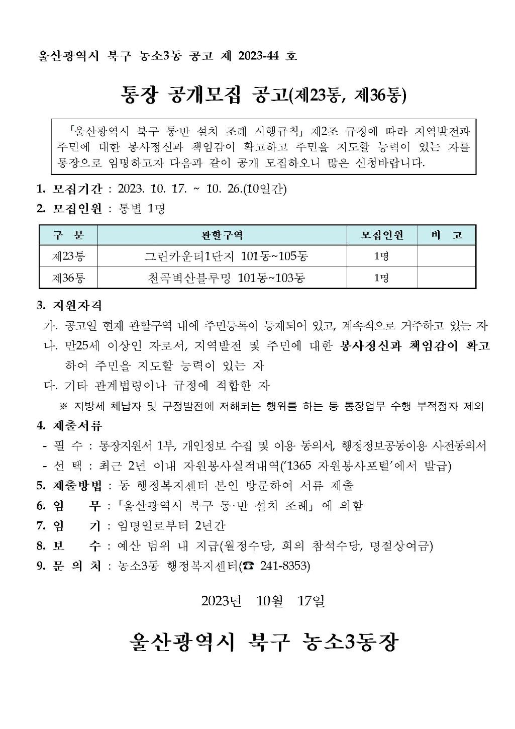 ★농소3동 통장 공개모집 공고(제23통, 제36통)
