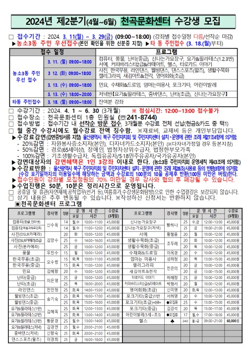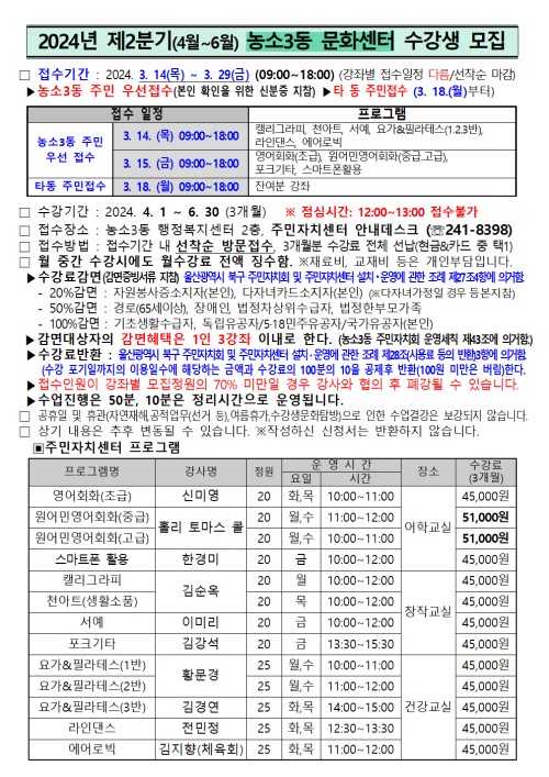 2024년도 제2분기 농소3동 주민자치센터 및 천곡문화센터 수강생모집 □ 접수기간 - 천곡문화센터 : 3. 11.(월) ~ 3. 29.(금) - 주민자치센터 : 3. 14.(목) ~ 3. 29.(금) - 타동주민접수 : 3. 18.(월) ~ 3. 29.(금) □ 수강기간 : 2024. 4. 1. ~ 6. 30. (3개월) □ 접수방법 : 접수기간 내 선착순 방문접수, 3개월 수강료 현금&카드선납 □ 접수장소 : 농소3동 행정복지센터 2층, 주민자치센터 안내데스크 (☏241-8398) 천곡문화센터 1층 민원실 (☏241-8744) ※ 자세한 내용은 첨부파일을 참고하세요.