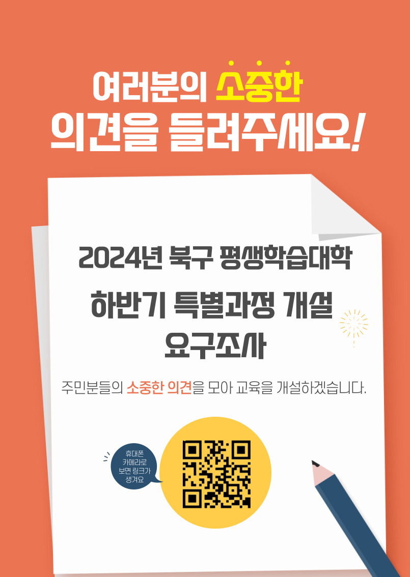평생학습대학 과정개설 요구를 조사 분석하고, 그에 따라 2024년 평생학습대학 하반기 특별과정을 마련코자 합니다. 이에, 아래와 같이 요구조사를 실시하오니 많은 참여 부탁드립니다. 가. 조사기간 : 2024. 6. 10(월). ~ 6. 21(금). 나. 조사대상 : 구민 누구나 다. 조사방법 - 온 라 인 : 설문 링크 게재