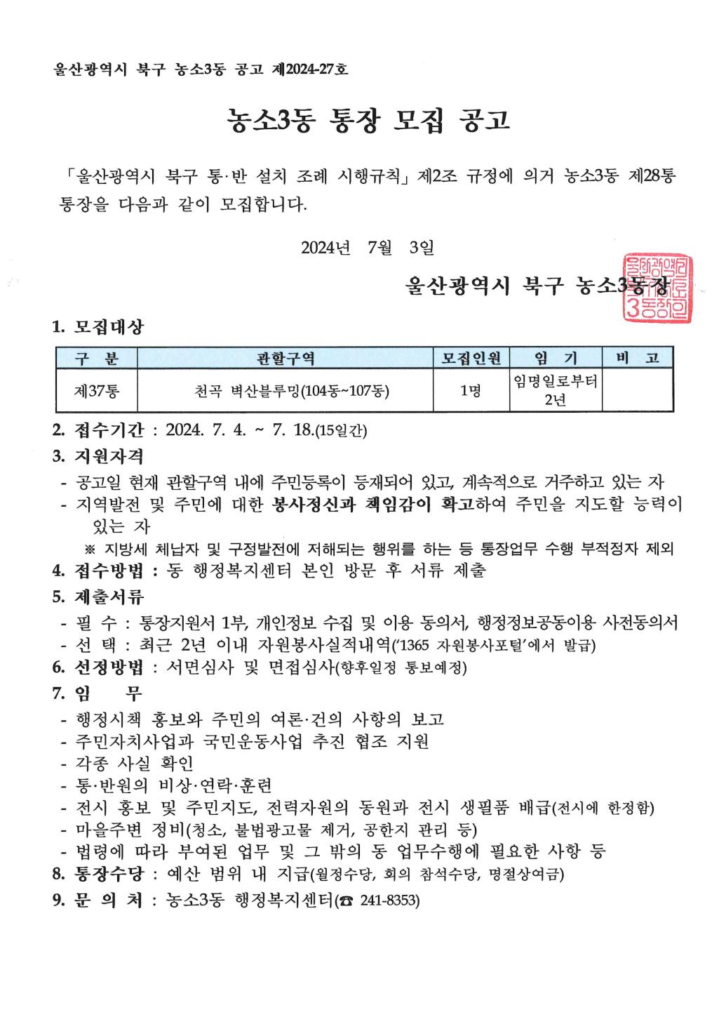 ★농소3동 통장 공개모집 공고(제19통, 제26통)