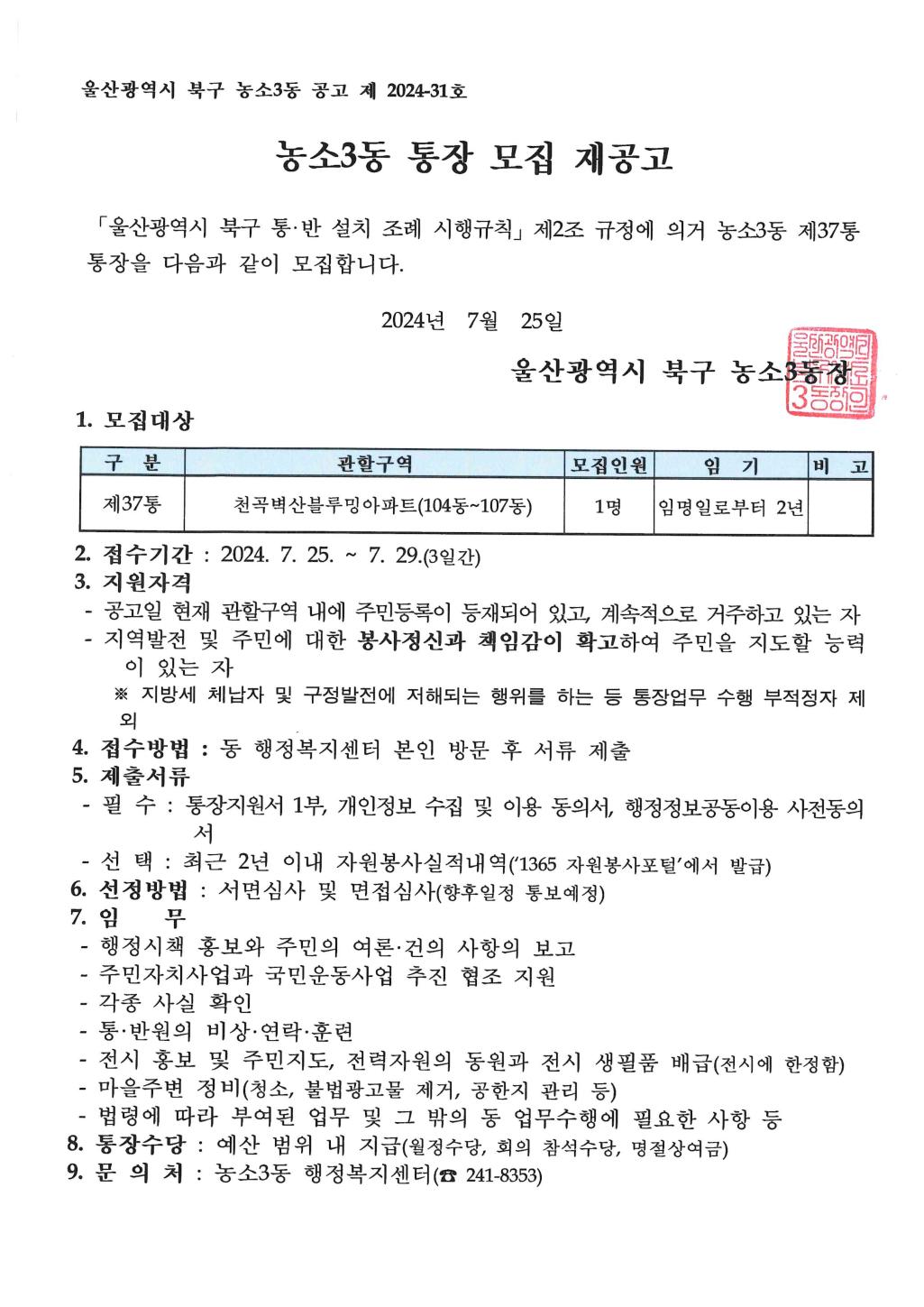 ★농소3동 통장 공개모집 재공고(제37통)