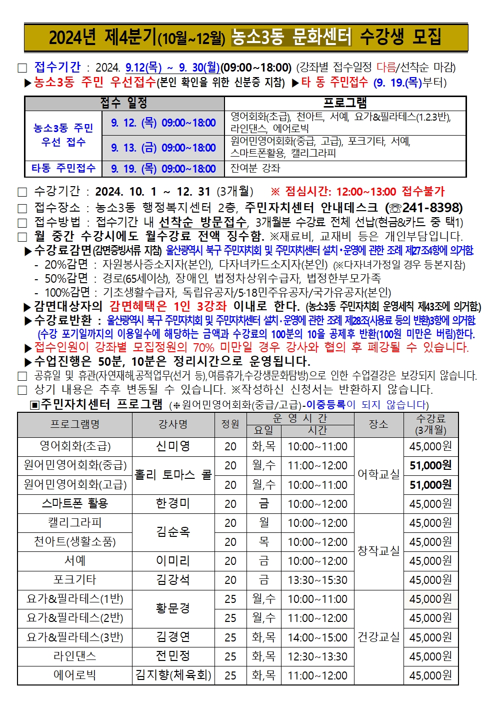 2024년 4분기 농소3동 주민자치센터 및 천곡문화센터 수강생 모집 안내