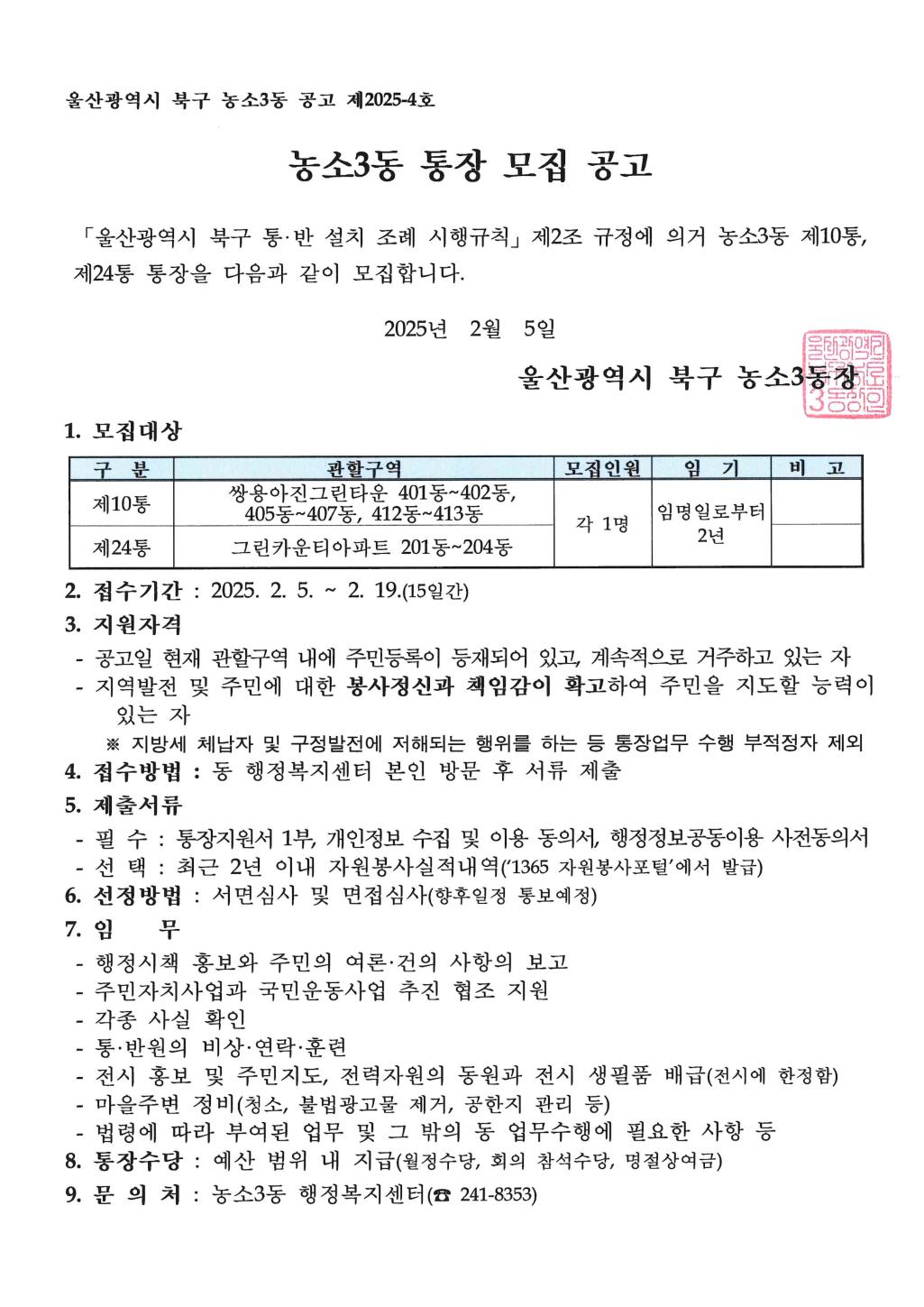★농소3동 통장 공개모집 공고(제10통, 제24통)