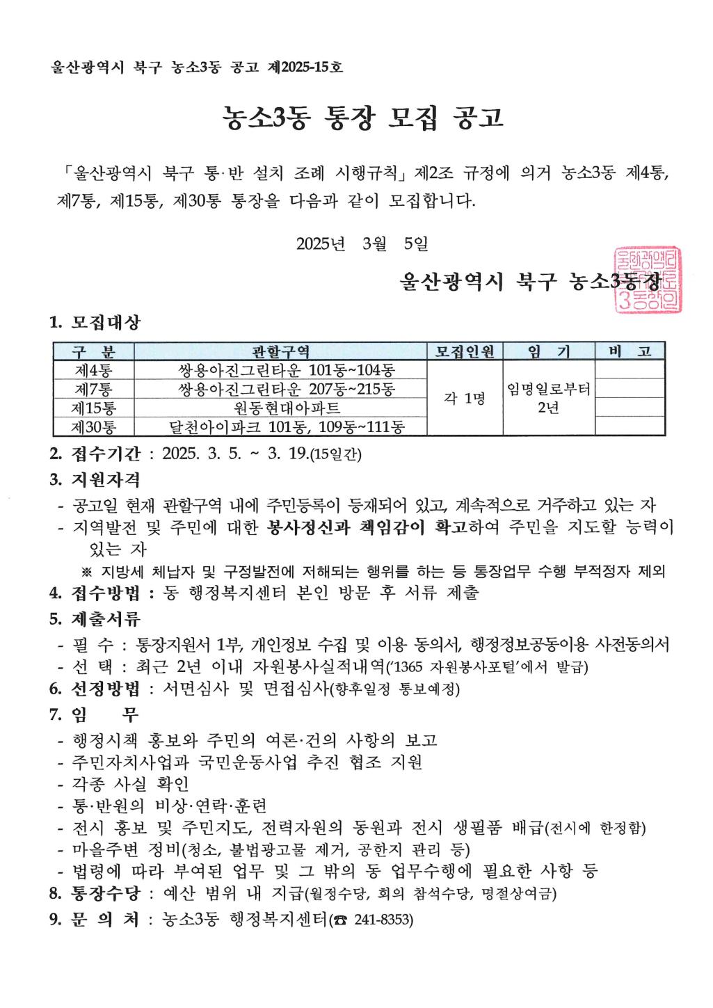 ★농소3동 통장 공개모집 공고(제4통, 제7통, 제15통, 제30통)