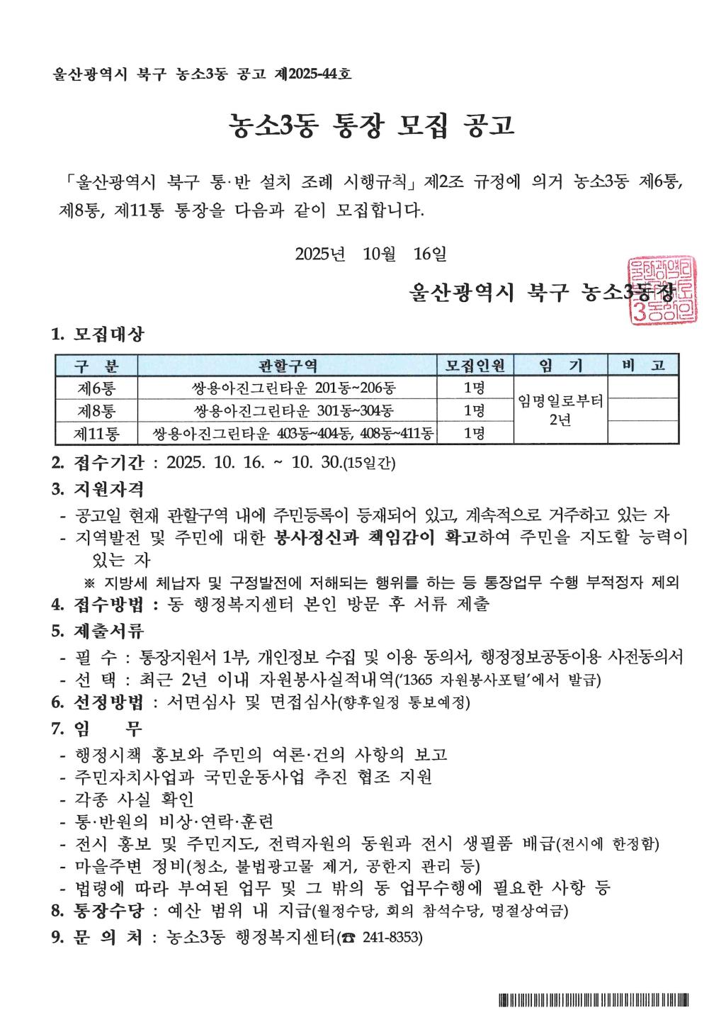 ★농소3동 통장 공개모집 공고(제6통, 제8통, 제11통)