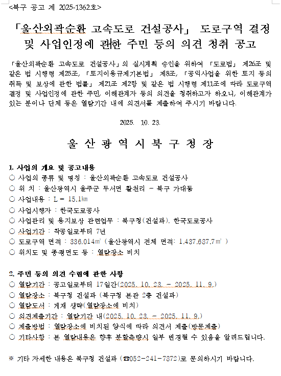 「울산외곽순환 고속도로 건설공사」 도로구역 결정 및 사업인정에 관한 주민 등의 의견 청취 공고