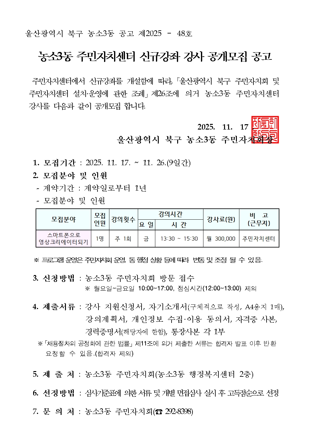 농소3동 주민자치센터 신규 강좌 강사 공개모집 공고