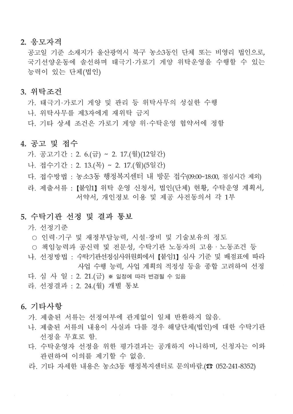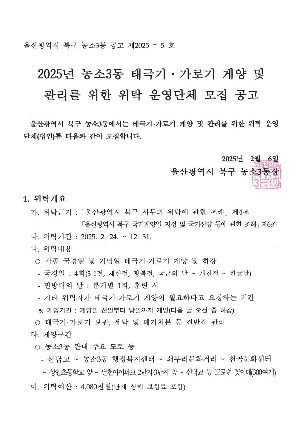 2025년 농소3동 태극기(가로기) 게양 및 관리를 위한 위탁 운영단체 모집 공고