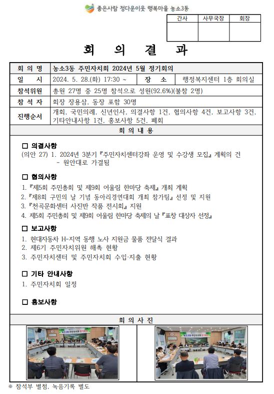 농소3동 주민자치회 2024년 5월 정기회의 결과 알림