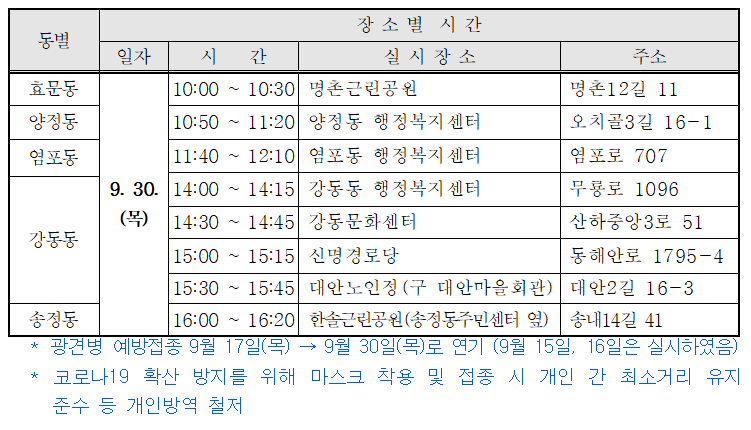 제14호 태풍 찬투의 영향에 따라 9. 17.(금) 실시 예정이던 광견병 예방접종 일정을 아래와 같이 연기하고자 하오니 참고하여 주시기 바랍니다.