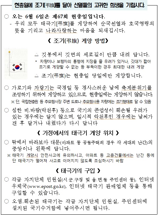제67회 현충일, 조기 게양으로 나라사랑하는 마음을 새깁시다.