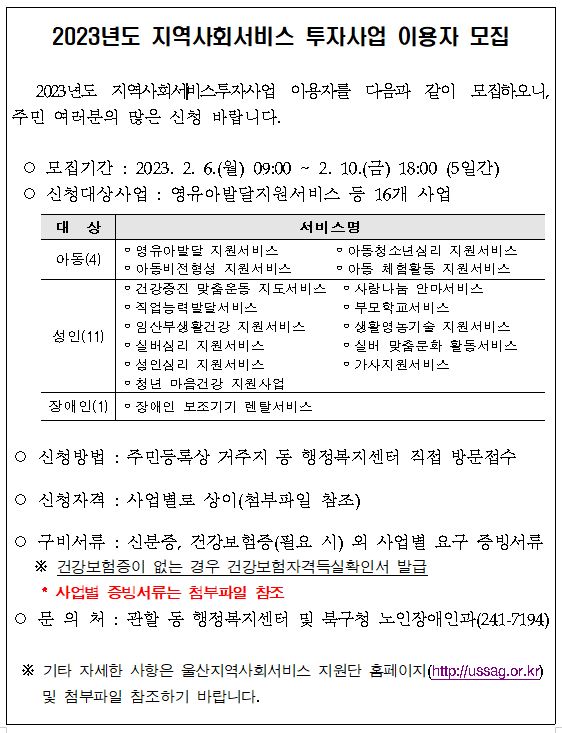 2023년 지역사회서비스투자사업 이용자 모집 안내